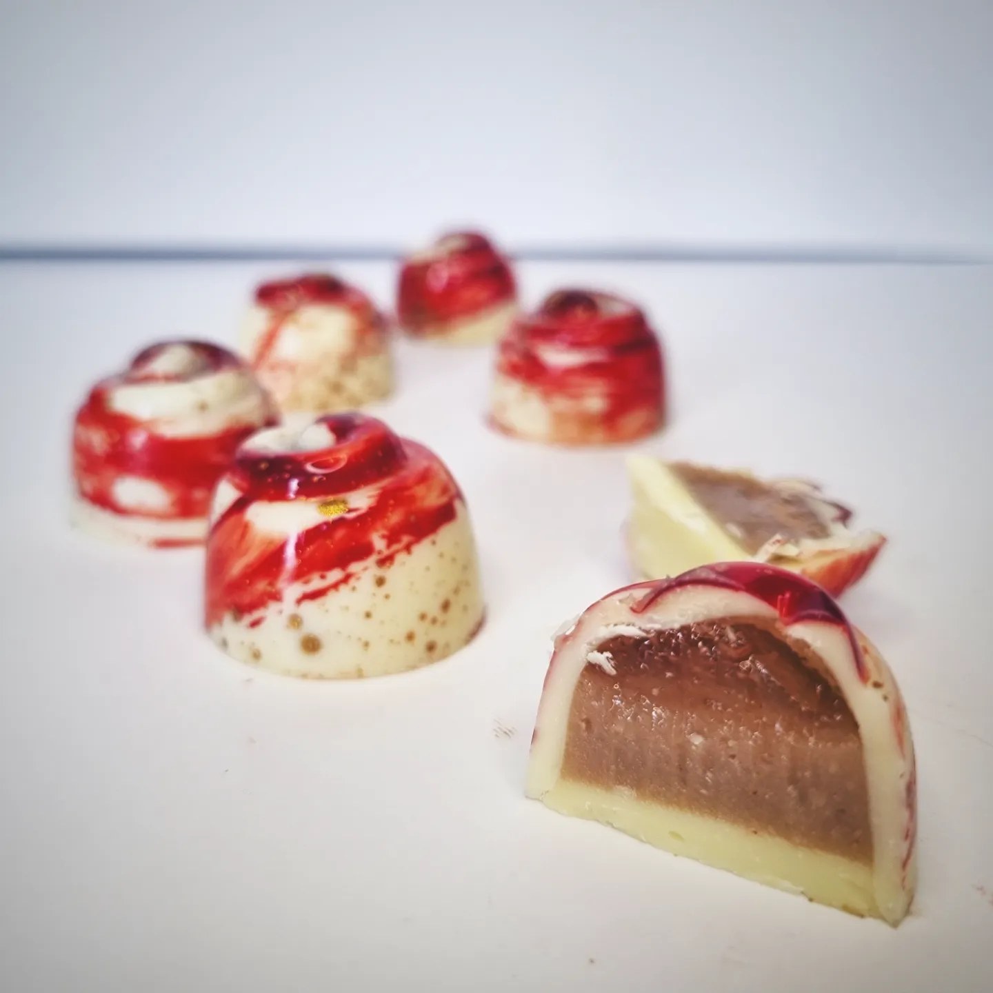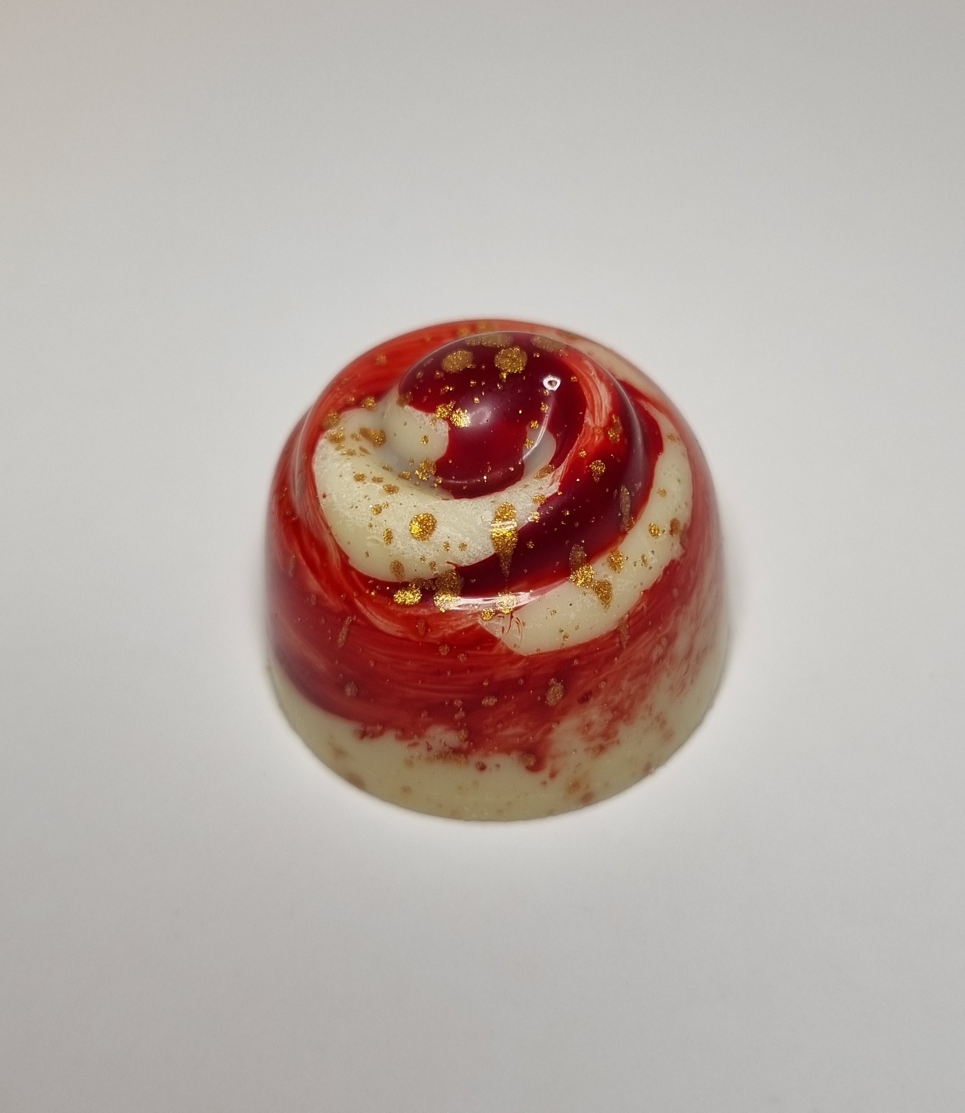 En läcker och vacker vitchokladpralin fylld med champagnegelé och smultronganache.