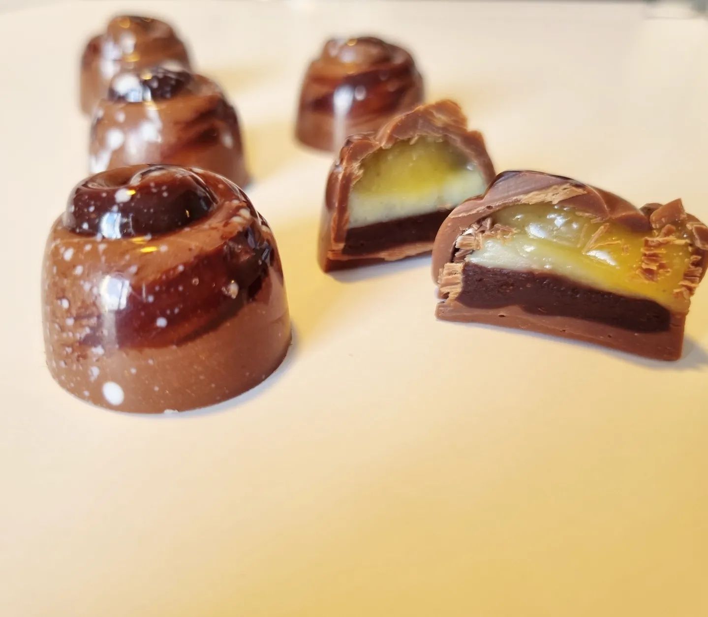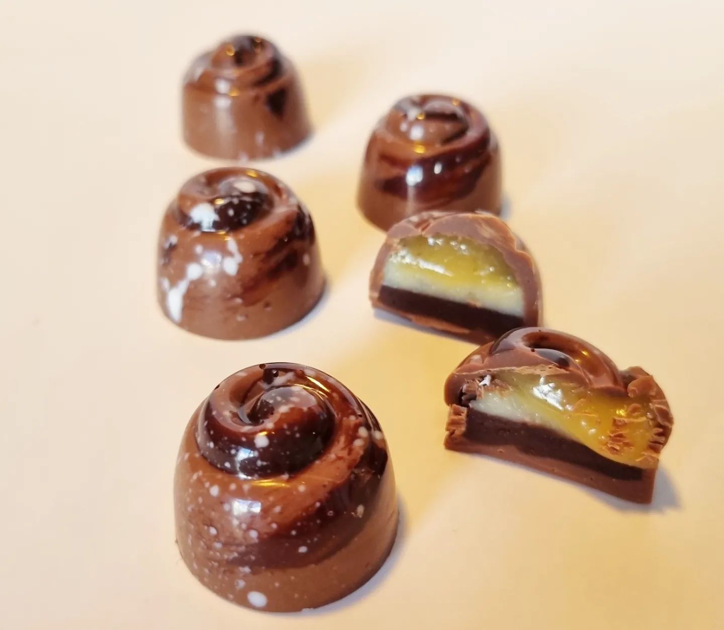 Mjölkchoklad pralin fylld med karamell, kardemummaganasche och kanelganache på mörkchoklad