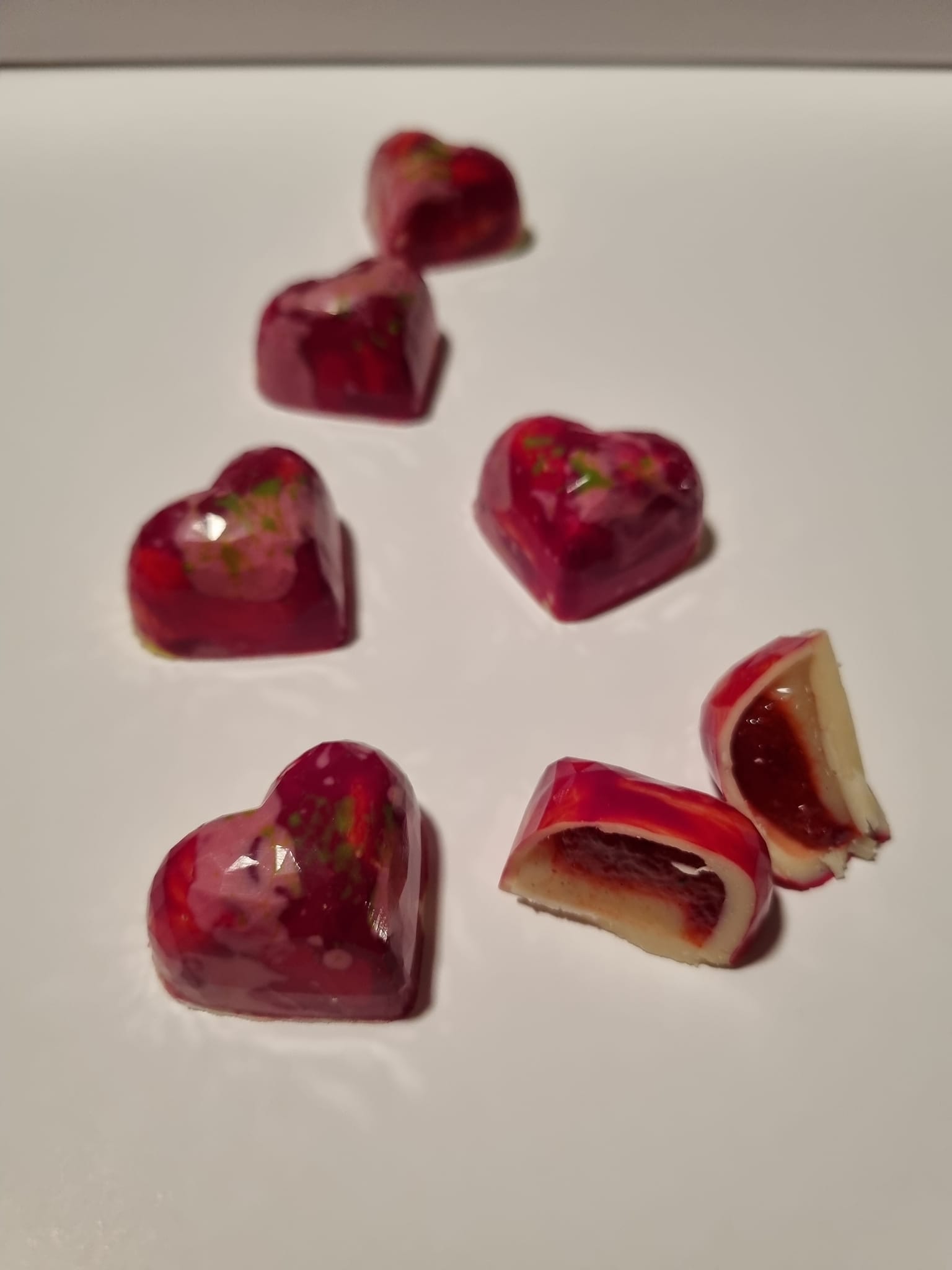Vitchoklad pralin fylld med rabarberpuré och kardemummaganasche